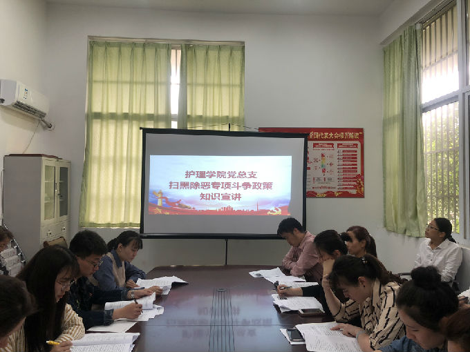 为积极响应市委组织部《关于在扫黑除恶专项斗争中进一步发挥党员先锋模范作用的通知》的要求,5月16日中午12:00,护理学院党总支开展了扫黑除恶专项斗争政策知识宣讲活动。本次活动由党总副书记胡宇主持,学院副院长周鸣鸣及全体党员出席。