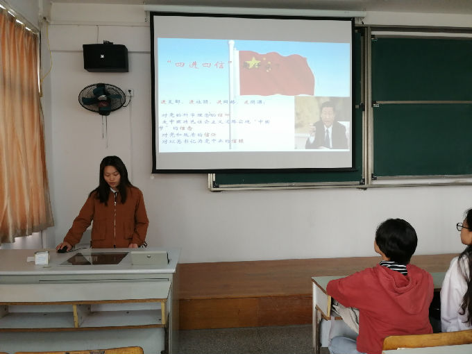 会议伊始,主持人向团员们简单介绍了“四进四信”的内容与主要目的,告知团员们要以“四进”为手段,“四信”为目的,不忘初心,坚持对党的爱护,让团员们深刻了解身为当代青年大学生的义务与责任,了解作为一名当代青年大学生,更要抓住机会,努力丰富自己的科学文化知识,提高自己的综合素质,牢记自己作为一名大学生的历史使命,培养自己的社会责任感,将来走入社会能发挥自己的预热,为实现中国梦添砖加瓦。