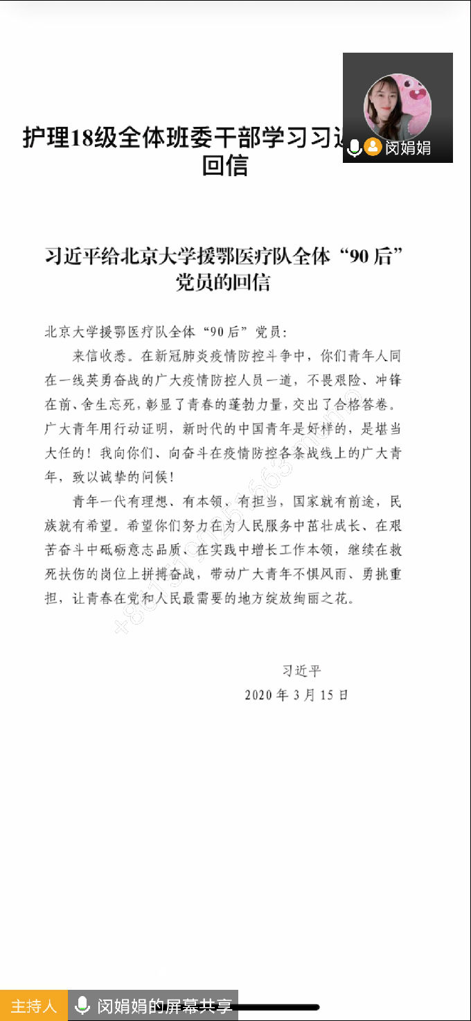 为深入学习贯彻习近平总书记给北京大学援鄂医疗队“90后”党员重要回信精神,并深化学习成效。护理学院18级全体班干部于2020年4月9日星期四14:00采用腾讯会议进行了线上集体学习研讨。此次会议由辅导员闵娟娟老师主持。