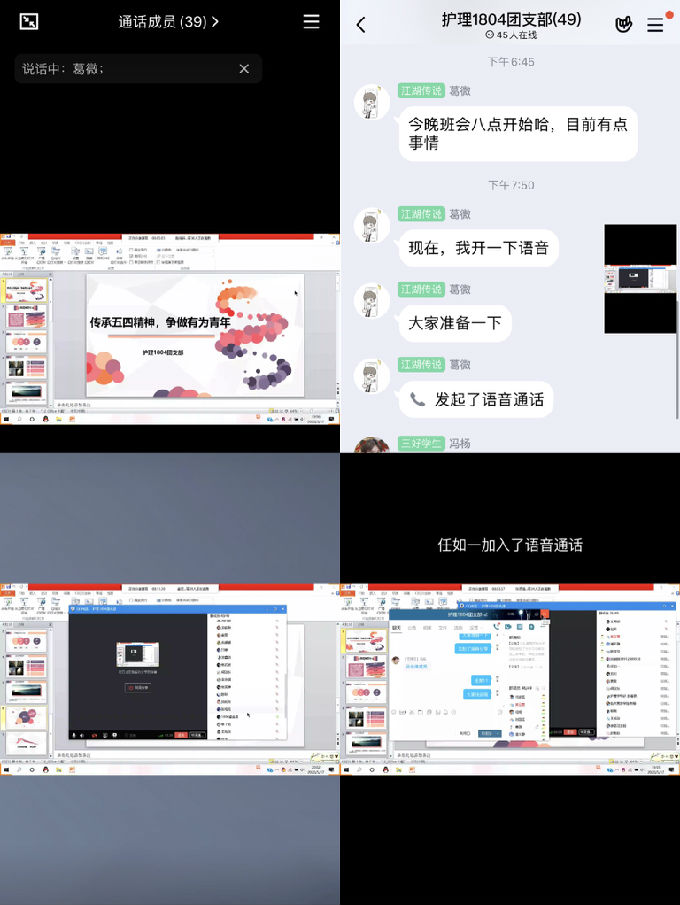 首先,团支书向同学们放映了相关PPT,讲述抗击新冠肺炎过程中有为青年的真实事迹,引导同学们树立正确的人生观价值观,找准方向,坚定理想信念,争做有为少年。同时同学们还学习了习近平总书记五四重要讲话精神,在此加深了对五四运动历史的了解,明白了继承和发扬五四精神的深刻意义。