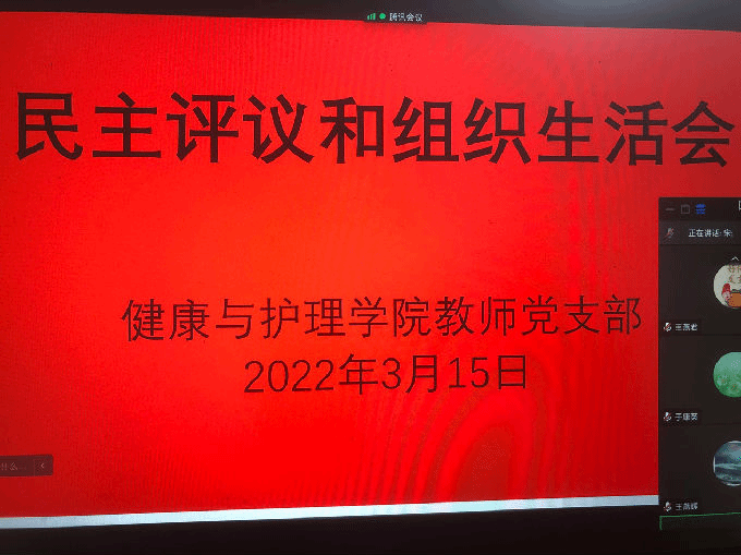 为了严格执行党的组织生活制度,以深入学习贯彻习近平新时代中国特色社会主义思想,学习贯彻党的十九届六中全会精神,落实省、市第十四次党代会部署要求为主题,深入领会党的百年奋斗重大成就和历史经验,3月15日中午,无锡太湖学院健康与护理学院教师党支部使用腾讯会议召开了线上2021年度民主评议和组织生活会,会议紧紧围绕主题,深入对照检查,严肃开展批评和自我批评。无锡太湖学院校党委委员周鸣鸣参加会议并指导,会议由无锡太湖学院健康与护理学院教师党支部书记宋绍征主持。