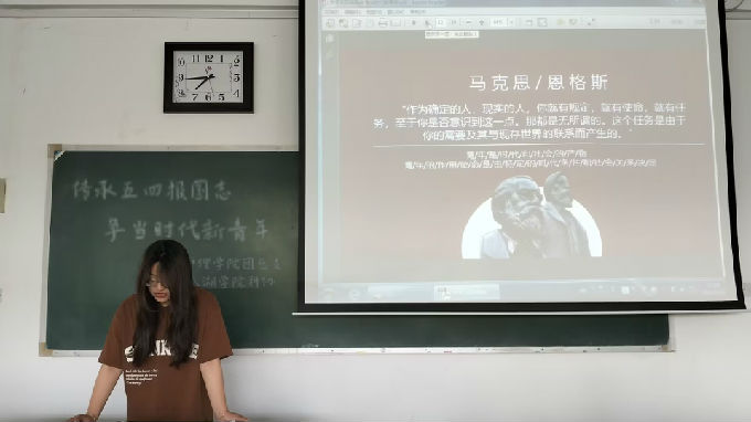 会议伊始,主持人简单介绍了五四青年节的来历,五四爱国运动是一次彻底的反对帝国主义和封建主义的爱国运动,也是中国新民主主义革命的开始,具有鲜明的时代特点和深刻的教育意义。随后,通过一则短视频,呼吁同学们继续弘扬五四精神,坚定理想信念,站稳人民立场,练就过硬本领,投身强国伟业,始终保持艰苦奋斗的前进姿态,同亿万人民一道,在实现中华民族伟大复兴中国梦的新长征路上奋勇搏击。最后,同学们明确了在新时代,青年既是国之栋梁,又是民族希望。广大青年应自觉将个人前途命运与社会主义前途命运紧紧联系在一起,应矢志不渝地传承五四精神。
