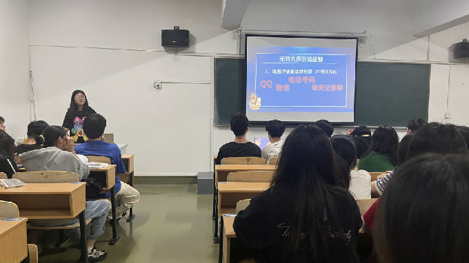 活动伊始,辅导员简单介绍本次班会的主题和目的,分析了本校开学以来几起比较严重的诈骗案例,以此提醒学生警惕诈骗,保护自己的财产和安全。随后,向同学们介绍了如何预防、应对诈骗,如下载安装国家反诈中心APP,关注平安无锡公众号,遭遇诈骗立即报警等,告诫同学们注意保护个人信息、不轻易点开来路不明的链接、妥善保管自己的财产、拒绝诱惑。最后,通过观看一系列的反诈视频,向同学们介绍常见的诈骗手段和类型,包括裸聊、刷单、客服退款等,告诉学生如何识别诈骗和预防被骗,不要轻易相信陌生人的承诺和要求,谨慎处理涉及到钱财和个人信息的事务。