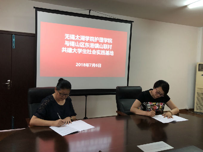 无锡太湖学院护理学院一贯注重学生在社会实践中获真知、见真情,为让学生在社会实践中能充分发挥自身才能,于7月6日下午由护理学院党总支副书记王凤琴、护理学院分团委马晓星老师与无锡市锡山区东港镇山联村村委会主任朱虹成功签订“无锡太湖学院大学生社会实践基地共建协议书”。