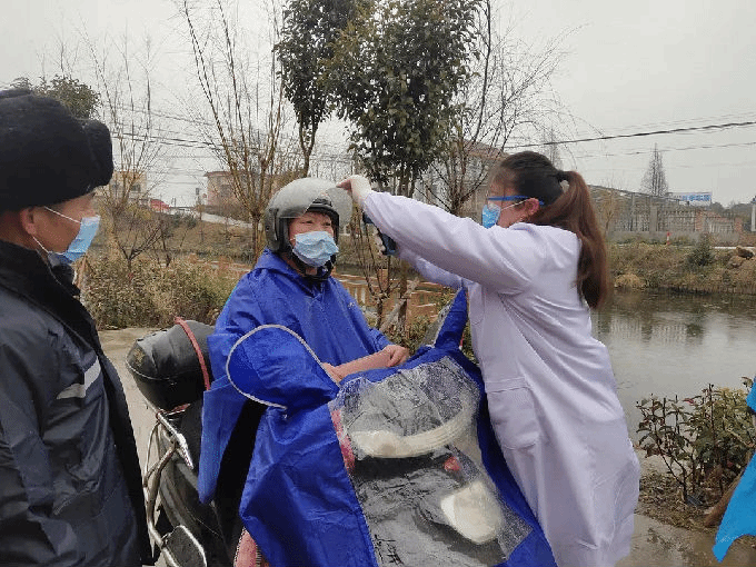 在介英村的卡点上,一名身穿护士服装的女大学生朱泓渝正在执勤。她用自己在学校所学的专业知识和医学护理经验,与卡点的其他志愿者起,仔细排摸登记车辆和人员信息,为进出村民测量体温,并为其他志愿者消毒做好防护工作。