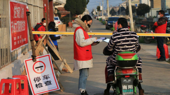 身着红色志愿服的陈姝彤和她父亲正在执勤,她用自己在学校所学的专业知识告诉每一位通行者怎么样做好新冠肺炎的防护工作以及注意事项;认真测量每位通行者的体温,检查出入村口证件并做好记录。