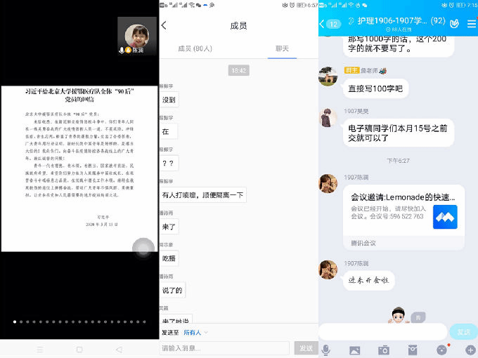 疫情面前,曾经的小朋友长大成为英雄,赴国难,救国人,抗病毒,一往直前,无所畏惧。2020年4月9日晚上6点40,护理1906,1907两班在辅导员詹老师组织下,开展线上学习习总书记给北京大学援鄂医疗团队全体“90后”党员的回信的主题班会,对“90后”抗击疫情发表个人看法,并呼吁全部护理学院学生向战士学习,慕英雄风采,感英雄行为。