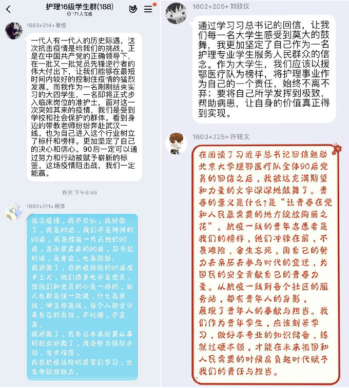 此次会议通过语音形式学习,在学习了习近平总书记对北京大学援鄂医疗队全体“90后”党员的回信中,我们都被这充满期望和力量的文字深深鼓舞了。同学们纷纷表达了自己的感想。