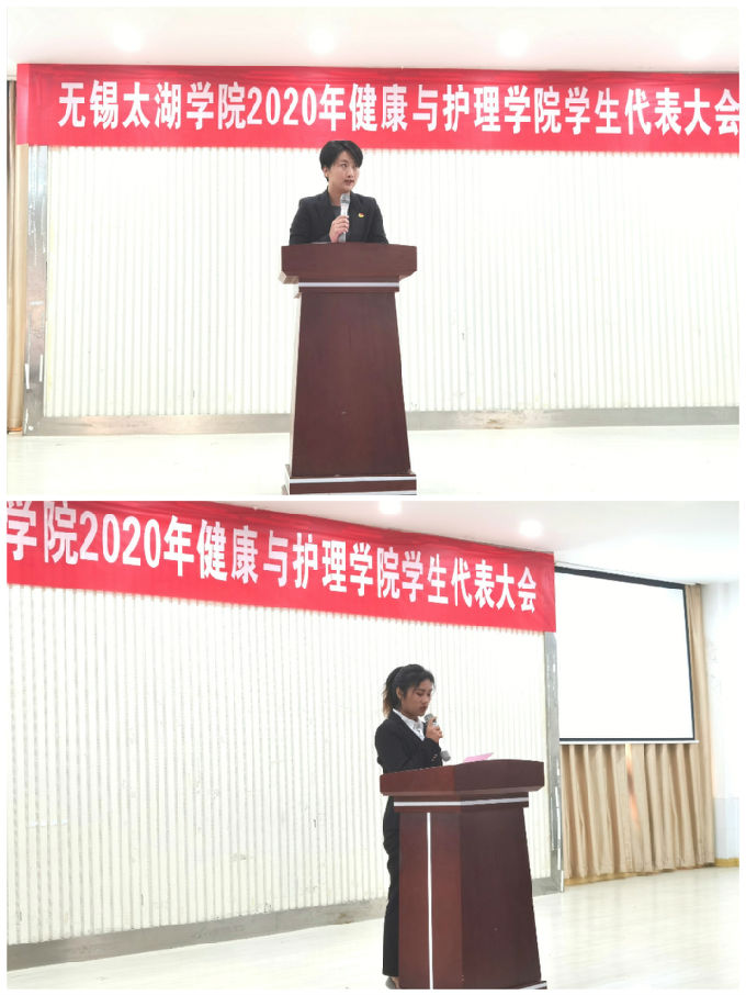 伴随着庄严的国歌声,本次大会拉开了序幕。首先,由校学生会主席团代表吕杨同学带来上级团委贺信。然后进入大会的第二项议程:由健康与护理学院团总支书记马晓星老师上台致辞,对往届学生会干部们的辛勤工作予以肯定。接着由健康与护理学院学生会主席王炎同学对无锡太湖学院健康与护理学院2019年-2020年学生会工作做了简要的回顾与汇报。