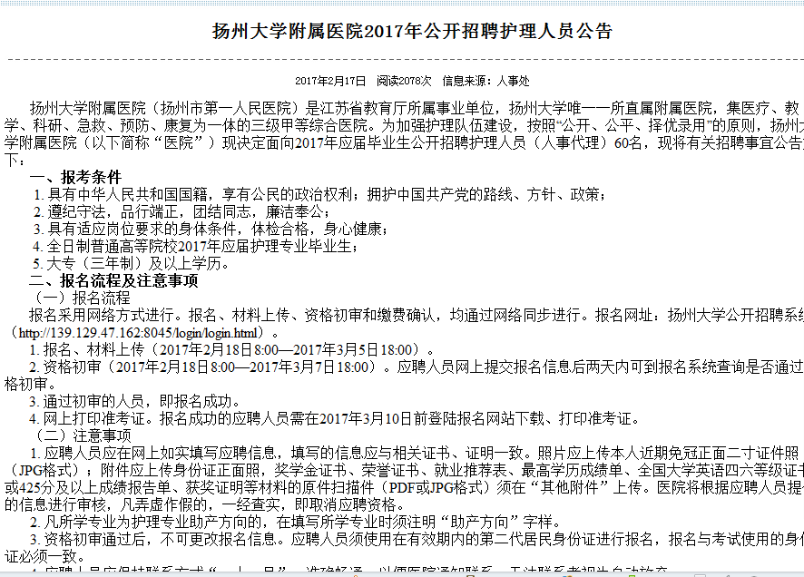 扬州大学附属医院2017年公开招聘护理人员公告