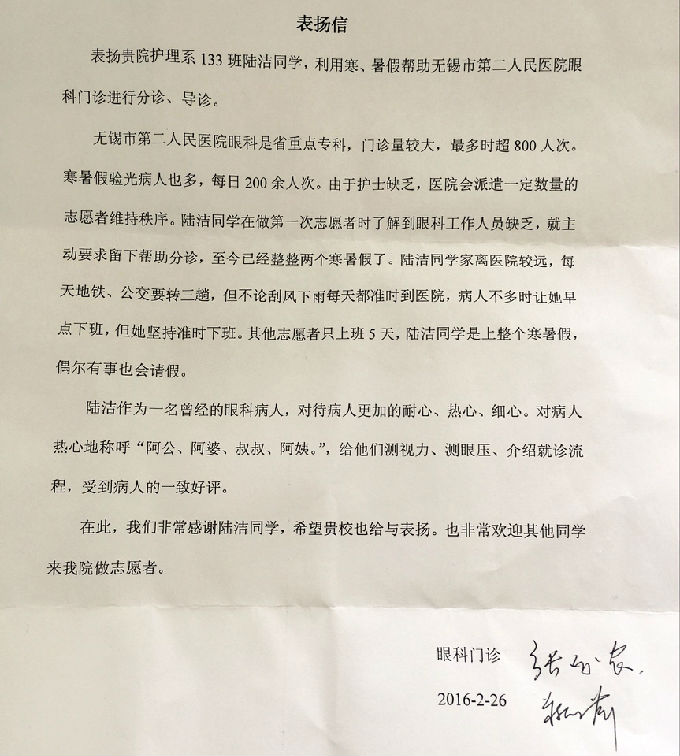我院护理133班陆洁同学,利用寒、暑假帮助无锡市第二人民医院眼科门诊进行分诊、导诊,对待病人耐心、热心、细心,受到二院的表扬。