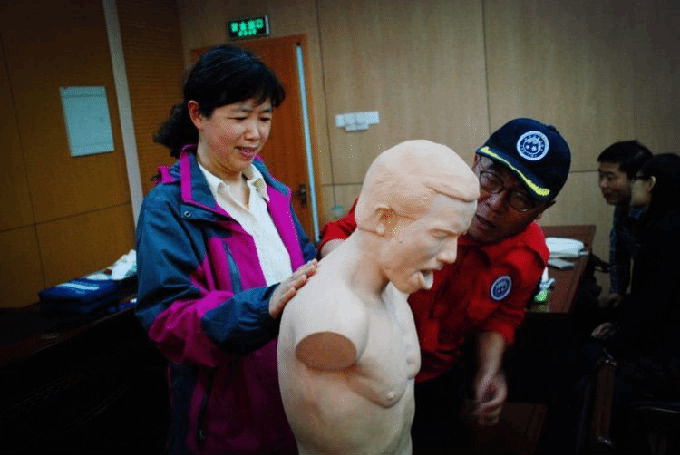 此外,志愿者们还耐心地讲解并示范成人和小孩异物梗阻的操作。同学们进行了仿真人体实验。在整个排除异物梗阻的讲解与练习过程中,整个现场充满了欢声笑语。在轻松的环境下,同学们学到了排除异物梗阻的基本方法。