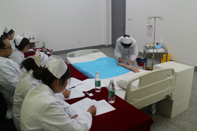 这次技能大赛的20位选手,都是从护理学院大三学生中选拔出来的,其中有两名男生,统一着装护士服。大赛操作内容为密闭式静脉输液,赛场布置与医院病房相同,有病床、有患者肢体,护士使用的手推车、治疗盘、输液架一应俱全,输液过程跟实况一致。选手进场后,随机抽取一个案例,按规定程序和标准操作,由院领导和老师组成的5名评委现场打分。据介绍,比赛规定每人在10分钟内完成全部操作程序,评委按个人仪表、操作前准备、操作过程等15个项目一一打分,分出伯仲。经过4个多小时的紧张角逐,范维莹、朱佩同学荣获一等奖,许立丽、王志敏、柳许凡、顾丽妍获二等奖,其他14名同学分享三等奖。