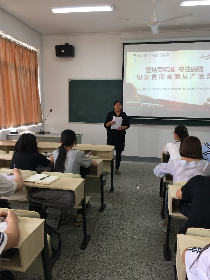 2017年5月31日下午12时30分,护理学院于教学楼5号楼205教室开展对《关于新形势下党内政治生活的若干准则》与《中国共产党党内监督条例》的学习课程,此次课程有护理学院全体教职工党员以及本次学校党训班的学生积极分子参加。