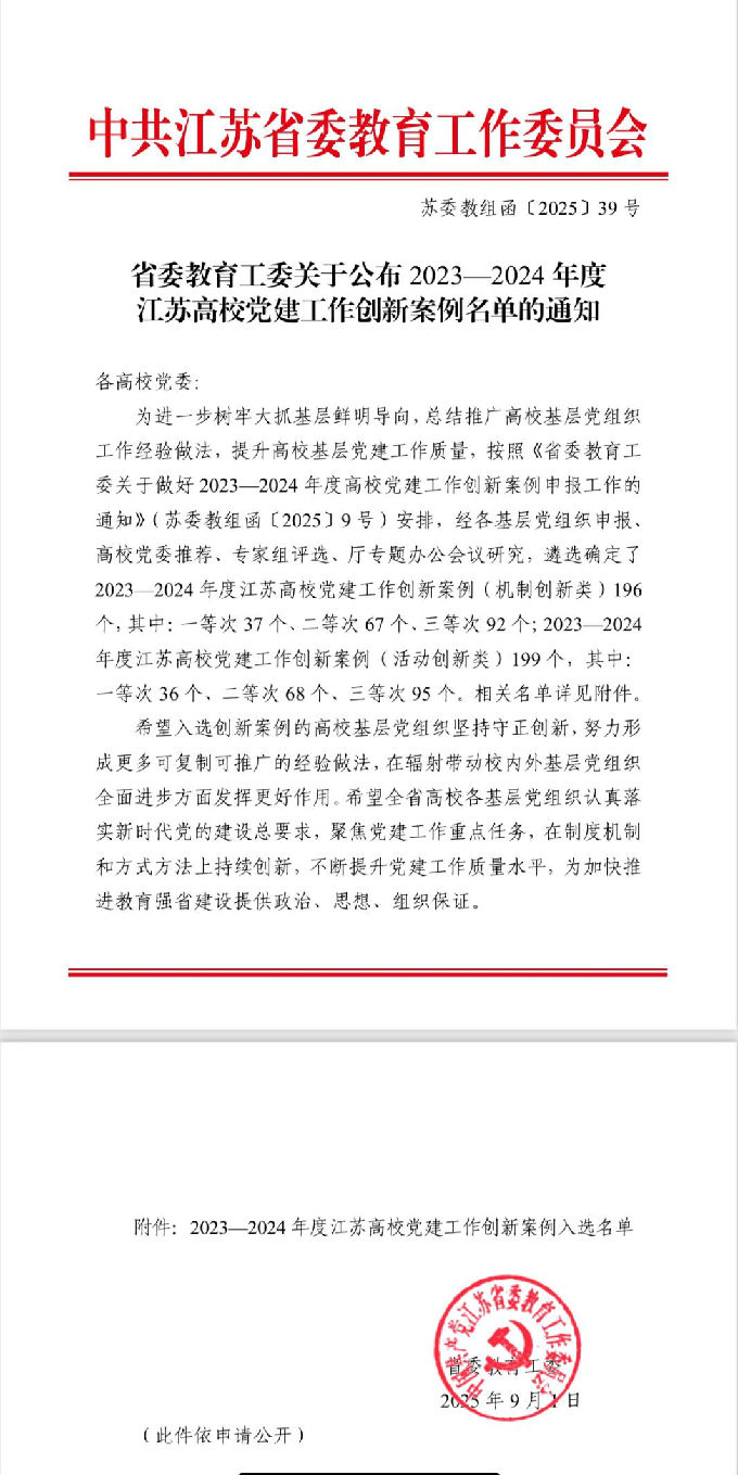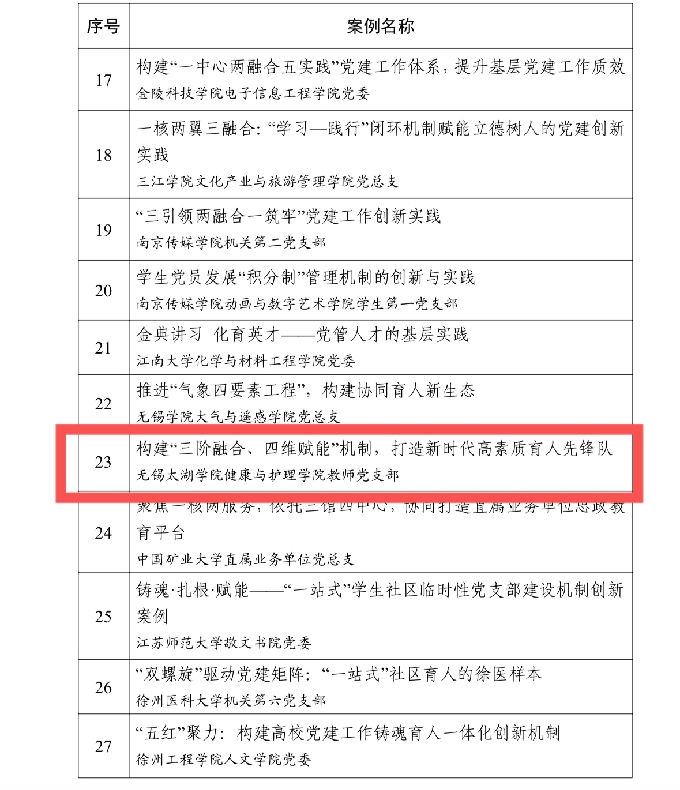 近日,中共江苏省委教育工作委员会公布了2023—2024年度江苏高校党建工作创新案例评选结果。无锡太湖学院健康医学院教师党支部和学生党支部报送的案例《构建“三阶融合、四维赋能”机制,打造新时代高素质育人先锋队》、《奔跑新时代,急救我先行》在众多申报项目中脱颖而出,成功入选江苏省高校党建工作创新案例,荣获省级表彰!