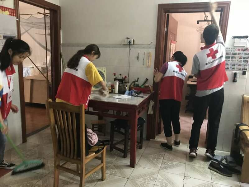 太湖学院的志愿者们为老人们上门打扫卫生。