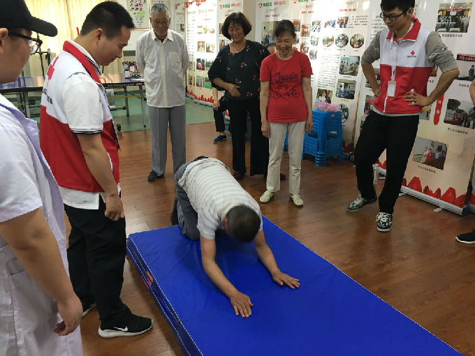 无锡太湖学院志愿者们和老人一起学习如何正确的摔倒,帮助老人学会这个技巧。