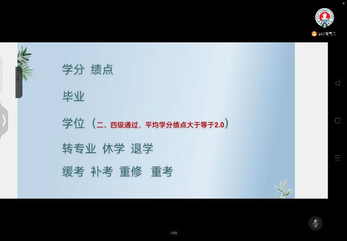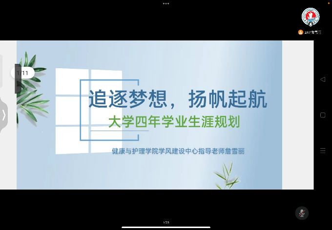 接着开展了“大学生学业生涯规划”主题教育,由学风建设中心詹雪丽老师主讲。詹老师从爱国、爱校、爱院、爱专业四个方面进行讲解,给新生大学四年学业生涯规划作出正确指引。健康与护理学院的学风建设成就显著,希望新生可以延续努力学习,拼搏进取的精神,大一努力通过英语四级考试和计算机二级考试,争取平均学分绩点大于等于2.0,以便获取毕业证书和学位证从学校顺利毕业,不负大学四年时光,交给自己一份满意的答卷。