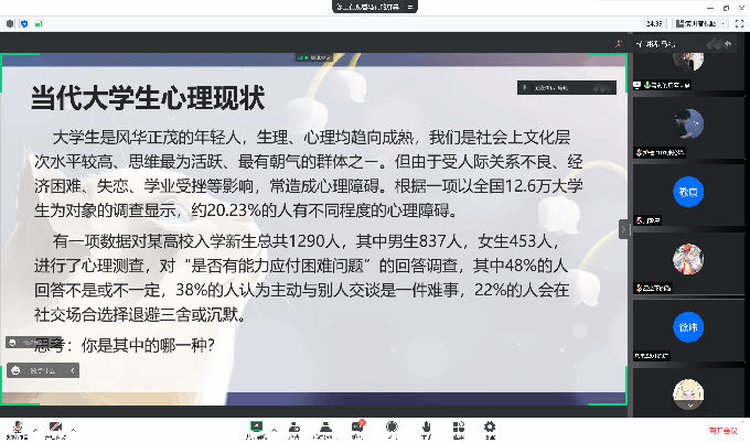 马莉老师分析了现代大学生性格特点、心理现状,并向大家阐明引起大学生心理障碍的原因主要包括生活适应问题、学习问题、诈骗问题、恋爱问题等。