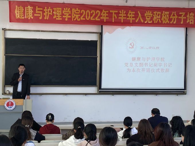 为深入贯彻落实习近平总书记在党的二十大的重要讲话精神,推动我院党建工作深入开展。2022年10月24日中午12点15在5号楼318教室顺利开展2022年下半年入党积极分子培训班开班仪式。本次开班仪式由健康与护理学院学生党支部书记陈春晓老师主持,校党委委员、健康与护理学院副院长周鸣鸣院长、健康与护理学院党总支副书记胡宇书记、健康与护理学院院长助理宋绍征博士、健康与护理学院党总支委员和2022年下半年入党积极分子参与。