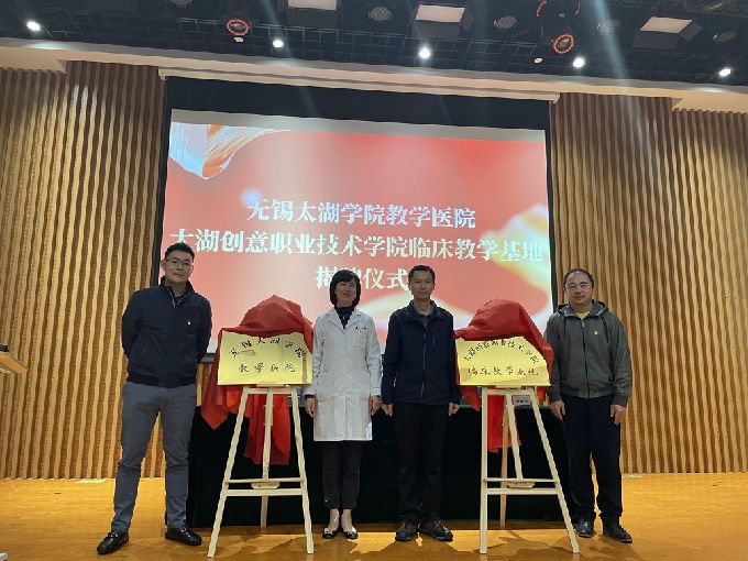 新吴区民政与卫生健康局副局长杨坚波、瑞金医院无锡分院邵洁院长、无锡太湖学业陈鹏飞副校长、太湖创意职业技术学院执行院长刘洪玉分别为“无锡太湖学院教学医院”“太湖创意职业技术学院临床教学基地”启用揭牌。
