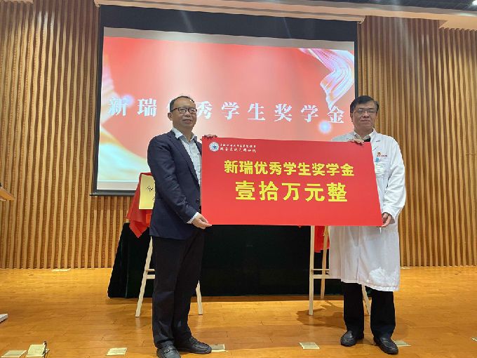 瑞金医院无锡分院党委书记袁锦祥向无锡太湖学院健康与护理学院副院长周鸣鸣授予“新瑞优秀学生奖学金”。