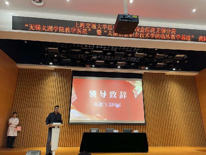 接着由无锡太湖学院陈鹏飞副校长致辞,陈校长简单介绍了无锡太湖学院的办学宗旨、学校规模、人才培养方案、学科设置、师资力量等各方面,他表示无锡太湖学院是无锡人自己的大学,获得地方党委政府的支持,到目前为止,学校设置了38个本科专业,校内开设了8个二级学院,在校生规模21600多,成为长三角地区同类高校里面规模最大、门类最齐全、综合排名最高的应用型本科院校。今天与上海交通大学附属瑞金医院无锡分院签订教学医院将进一步推动医学人才的培养,为无锡及周边城市培养更多专业型、优质型的医护人才,也为我校医学教育发展指明了方向、提供了遵循,进一步推动长三角城市群的医疗资源融合。