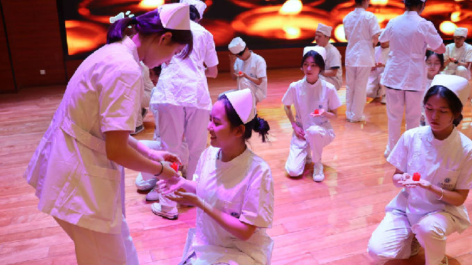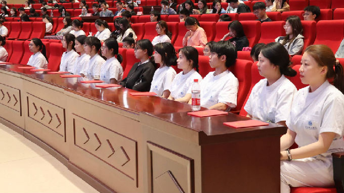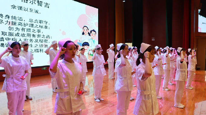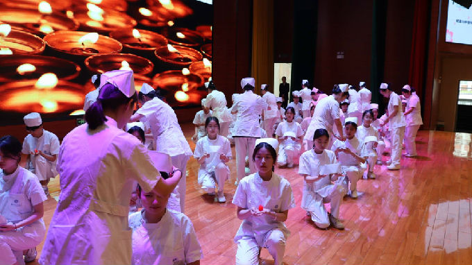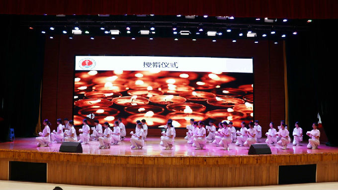 随后,进入本次大会高潮授帽仪式。一位位白衣天使带着欣喜、自豪和一颗坚定的心缓缓走上舞台,戴上象征责任与使命的燕尾帽,接过前辈手中的象征无私奉献的蜡烛,传承守护生命的责任,继承和弘扬南丁格尔精神。紧接着全体师生在领誓人的带领下庄严宣誓,学生们慷慨激昂地宣读南丁格尔誓言,将一声声誓言深深刻进心里。