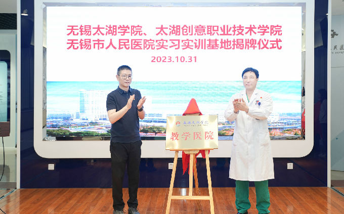 丁涛书记与邵君飞院长共同为无锡太湖学院教学医院实习实训基地揭牌。