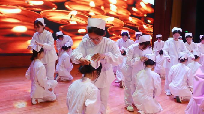 随后进入本次大会高潮,授帽仪式。一位白衣天使带着欣喜、自豪和一颗坚定的心缓缓走上舞台,戴上象征责任与使命的燕尾帽,接过前辈手中的象征无私奉献的蜡烛,继承和发扬护理事业的光荣传统,继承和弘扬南丁格尔精神。紧接着全体师生在领誓人的带领下庄严宣誓,将每一句誓言深深刻进心里。